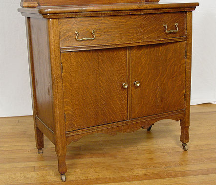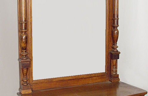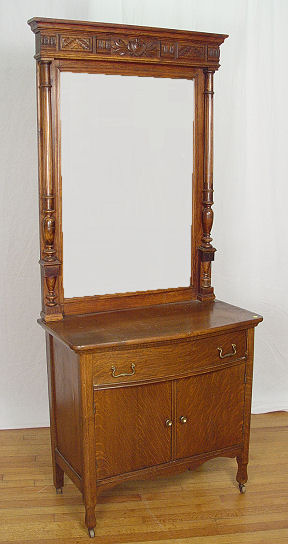 AMERICAN OAK FOYER STAND WITH TALL MIRROR: Marriage of a washstand and more ornate mirror with turned columnar stiles, carved top rail. 77'h. x 33'' x 17''.