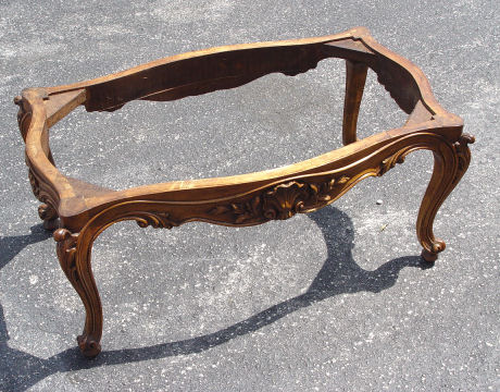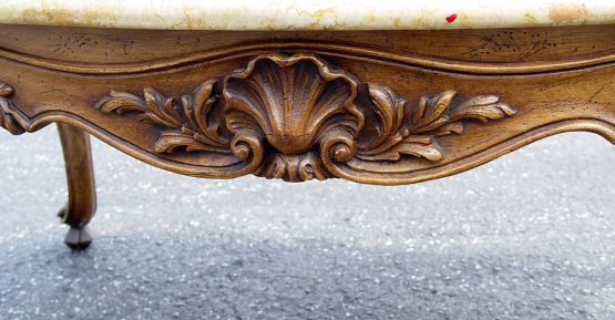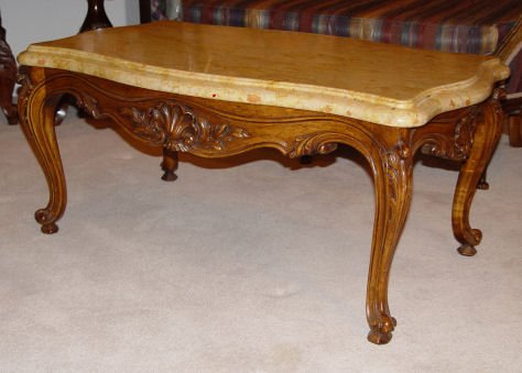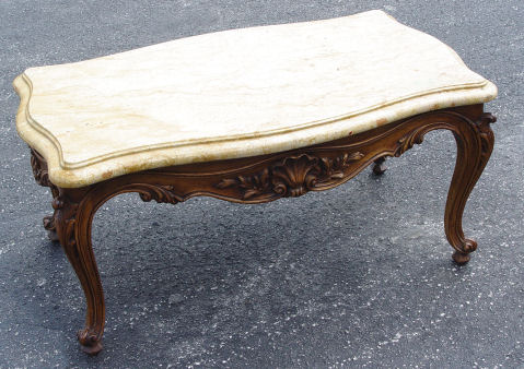FRENCH WALNUT CARVED COFFEE TABLE W/SCULPTED MARBLE TOP: 17'' h. x 38'' x 24''.