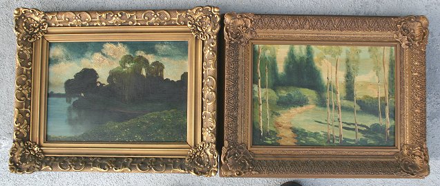 PAIR OF GOOD EARLY 20TH CENTURY LANDSCAPES: From the same estate, unclear if the same artist painted both pieces. (1) Bayou scene, O/Masonite, 10'' x 14'', no visible signature, encased in a high quality embossed gilt frame with minor wear, 15 1/2'' x 19 1/2''. (2) Depicts a woodland path, O/Masonite, 10'' x 14'', no visible signature, encased in period embossed gesso frame, 15 1/2'' x 19 1/4''.