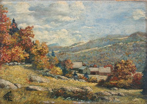 AMERICAN? IMPRESSIONIST COUNTRY VALLEY LANDSCAPE WITH FARM HOUSES: O/B, 10'' x 14'', signed Chalmers lower left, dated '24, encased in a worn gilt liner, 12'' x 16''.