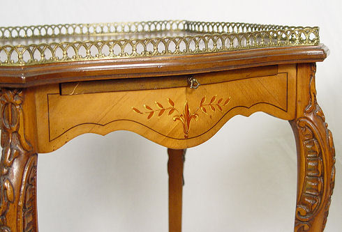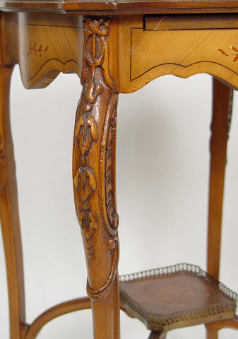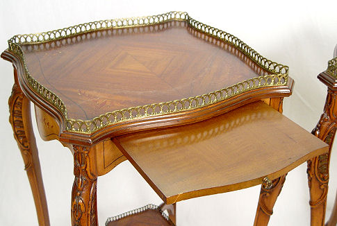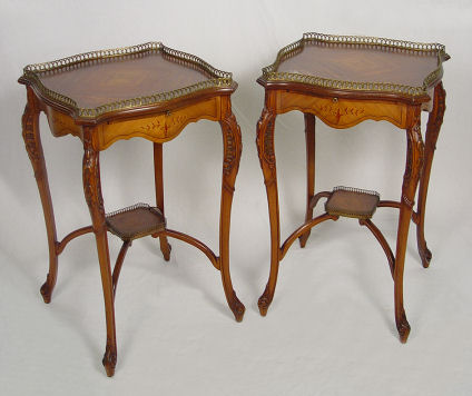 PAIR OF INLAID SATIN WOOD SIDE TABLES: Two tier table with shaped and carved legs, brass galleries to both levels, slide out tray, 28 1/2'' x 18'' x 18''..