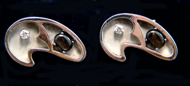 MODERNIST 14K & DIAMOND CUFF LINKS: Check marks of 14k white gold set with approx. 30pts total of diamonds and oval obsidian? stones, 1 5/16'' x 13/16'', approx. 31 grams total.