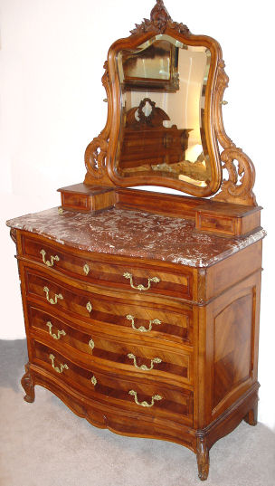 FRENCH VICTORIAN MARBLE TOP DRESSER: Beveled swing mirror between ornately carved supports, red marble top, bowed front, four full length drawers. 79'' h. x 46'' x 23''