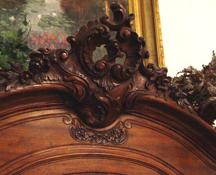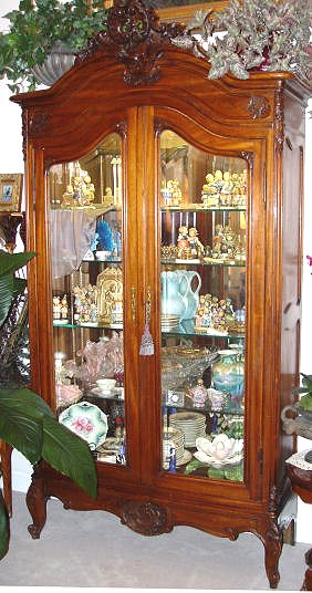 19TH C FRENCH WALNUT LOUIS XV CURIO: Arced carved crest, bevel glass doors. Illuminated mirror back, adjustable glass shelf interior. Displays beautifully. 98''h. x 47'' x 17''.