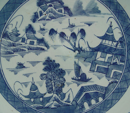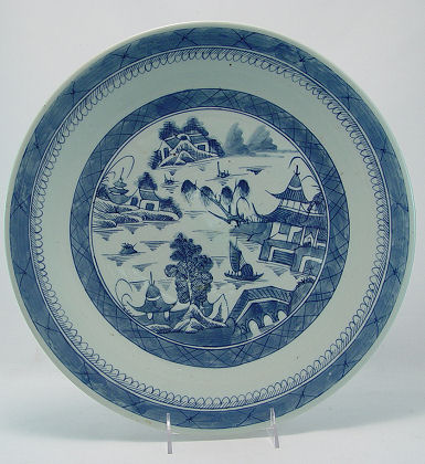 CHINESE CANTON CHARGER: Blue and white scenic landscape, 14 3/4'' dia.