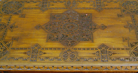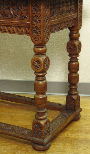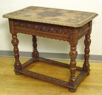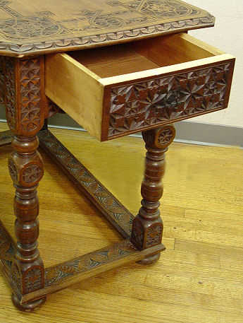 19th C GERMAN CHIP CARVED LIBRARY TABLE: Overall carving, even on the surface, stretchers and legs. Hidden side drawer. 36''h. x 39'' x 23''.