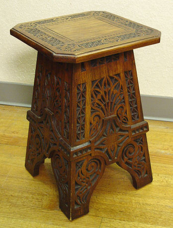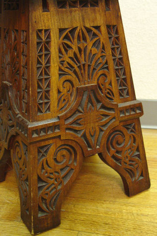 1850'S GERMAN CHIP CARVED TAMBOUR TABLE: Somewhat Morrish in style with pierce carved base. 18 3/4''h. x 12 1/4'' square top.