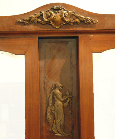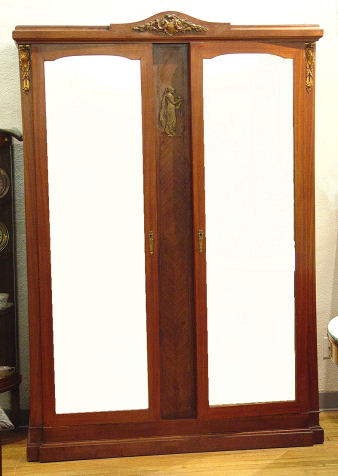 ITALIAN ARMOIRE: Double mirror front door, decorated with a metal mount figure of a Roman maiden. Straight cornice with arched center. Ready for your shelf or bar interior. 82 1/2''h. x 56 3/4'' x 22 1/2''.
