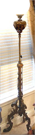 VICTORIAN ROCOCO GILT BRONZE PIANO FLOOR LAMP: Oil lamp converted to electricity, Birks stamp is on the connector ring. White ''Blown out baby'' glass globe shade. Adjustable height.
