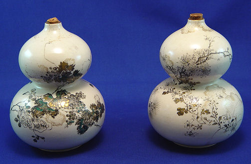 PAIR OF FINE JAPANESE SATSUMA DOUBLE GOURD BOTTLE VASES: Fitted with cork tops, hand painted, partial paper lables on underside. 6 1/2''h.
