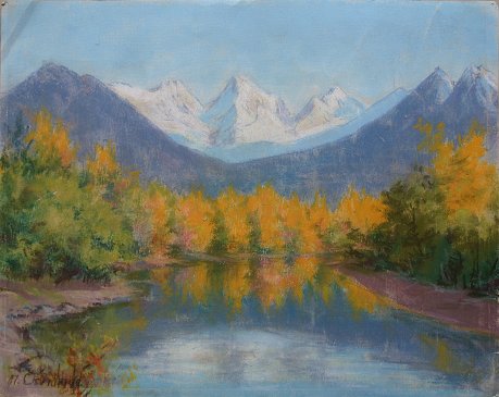 CRUMRINE, (American, 1889-1959): Alaskan lakeside landscape, Pastel, 12'' x 15'', signed lower left, unframed. Crumrine was an early artist of Alaska.