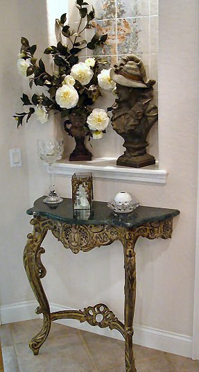 CARVED ITALIAN CONSOLE TABLE: Black serpentine marble top, 35'' x 85'' x 15 1/2''.