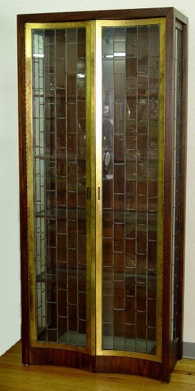 TALL DOUBLE DOOR LEADED GLASS CABINET: Double convex doors of leaded clear glass, flat lead glass sides, gold gilt trim to mahogany? wood, 4 glass interior shelves trimmed in matching wood, lit from bottom and top, 82 1/2''h. x 36''w. x 16''d.