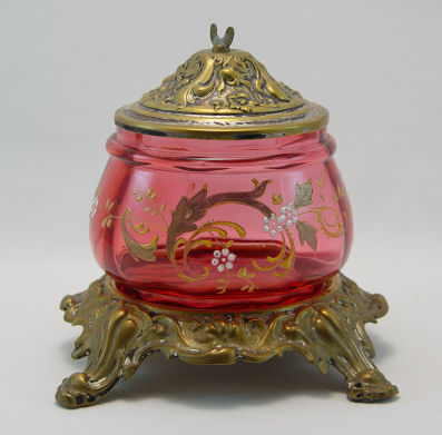 VICTORIAN CRANBERRY GLASS COVERED JAR: Hand enameled cranberry glass with embossed metal cover and stand. Jar is 4'' dia.