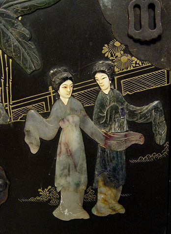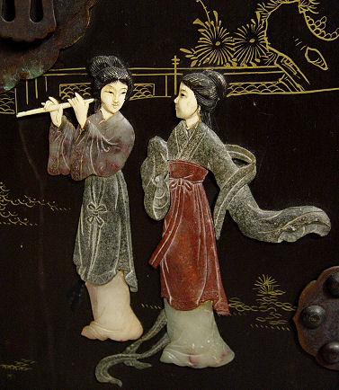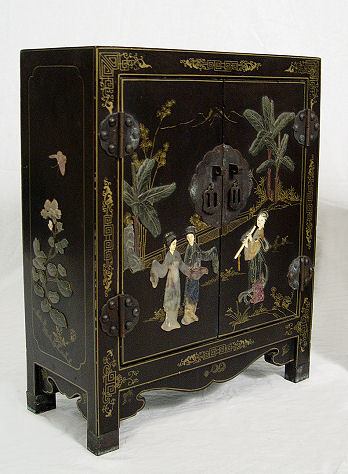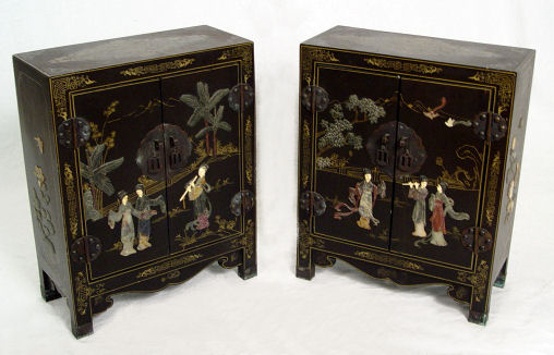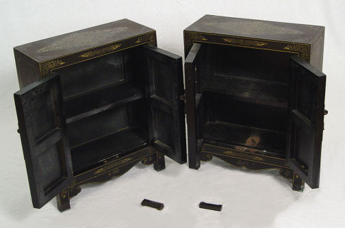 PAIR OF DIMINUTIVE CHINESE LAQUERED CABINETS: Carved stone and paint decorated two door cabinets, shelf interior. 22''h. x 17 1/4'' x 7 1/2''.
