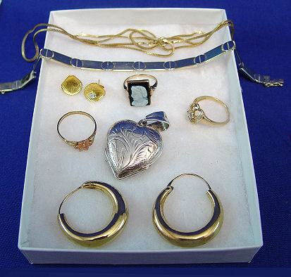 SMALL LOT OF GOLD AND STERLING JEWELRY: To include, Gucci style bracelet of 14k gold, approx. 7 1/2''l., pressure clasp needs work but only if you want to be able to remove from your arm; 24'' box link chain of 14k yellow gold; sterling heart shaped locket, embossed foliate design, holds four images; pair of puffed hoop earrings; shell shaped post earrings; onyx? based cameo ring in yellow gold mounting marked HandMade 10K, size 4; yellow and rose gold floral ring, marked AFR 14k, size 7.5; adorable diamond heart ring set with round and baguette stones, yellow gold, marked 14k ZEI, size 7.25. Sold as a lot.