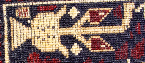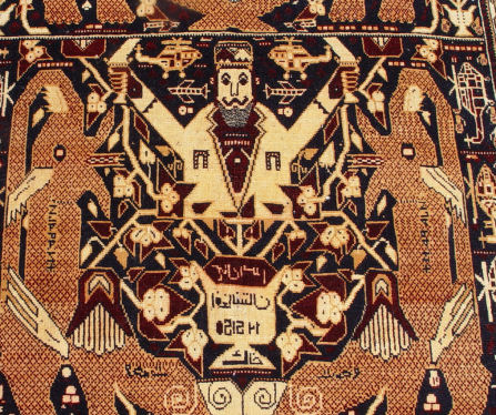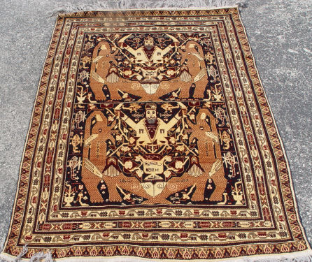 SIGNED PERSIAN CARPET WITH HELICOPTERS AND FIGURES: Approx. 4'8'' x 3'2''