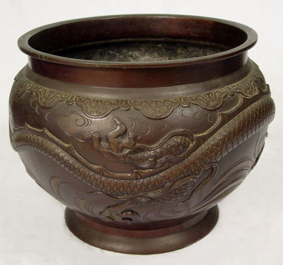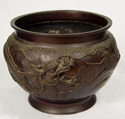 LARGE ORIENTAL BRONZE JARDINERE: Full bodied dragon encompasses the jar. Impressed makers marks. 12 1/2''h, 11'' dia.