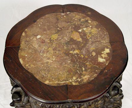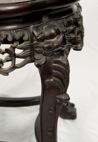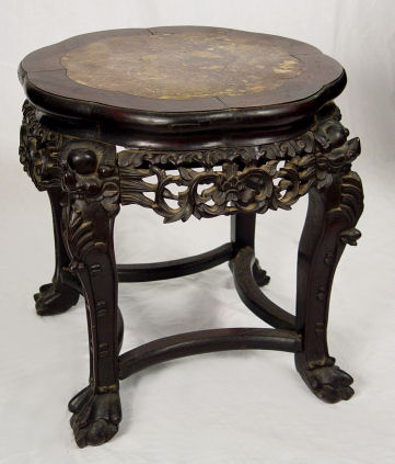 EARLIER CHINESE CARVED JARDIERE STAND: Inset with red marble, 18''h, 17'' dia.