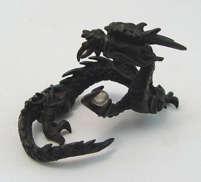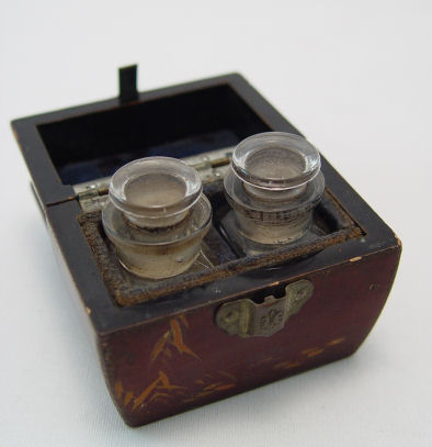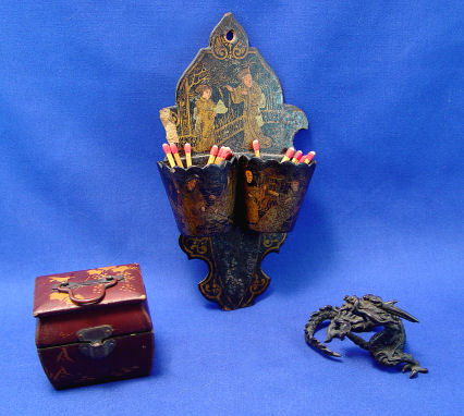 ORIENTALIA INCLUDES DRAGON, INK BOTTLE BOX & LACQUERWARE MATCH HOLDER: Dragon holding a clear ball is 2'' x 2 3/8'' x 3 1/4'', chinoiserie box with bottles is 2 1/2'' x 2 5/8'' x 1 3/4'', chinoiserie match holder is 7/8'' x 4 1/4'' x 1 1/2''. All earlier 20th C.