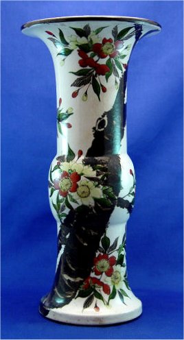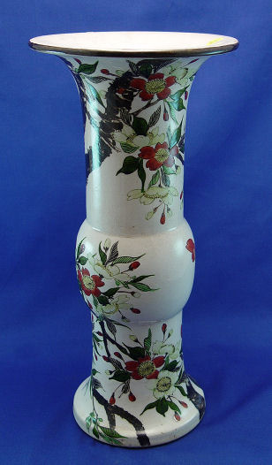 TALL HAND PAINTTED FAIENCE VASE: Double mountain mark, perhaps Fukigawa. 17 1/2''h.