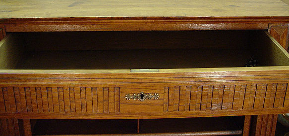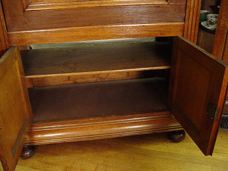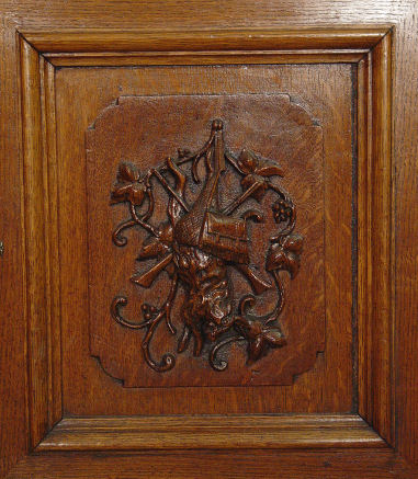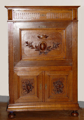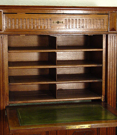 CARVED OAK SECRETAIRE ABATTANT TYPE DESK CABINET: Carved with a crown on the fall front behind of which are 8 compartments and a green leather desk surface. Game birds are carved on the cabinet doors on the lower compartment. Full length drawer across the top. Turn of the century. 62 1/2''h x 41 3/4'' x 18 3/4''.