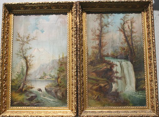 PAIR OF 19TH CENTURY EUROPEAN LANDSCAPE PAINTINGS: Both pieces depict waterside scenes with one being an alpine lake waterfall, and the other a forest waterfall scene, both pieces are O/C, both are monogrammed, alpine scene is 1896 and forrest waterfall is 1892, both are 20'' x 12'', encased in matching period frames with wear and missing gesso, 24'' x 15 1//2''.