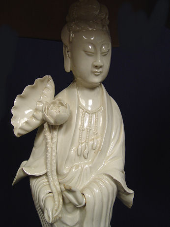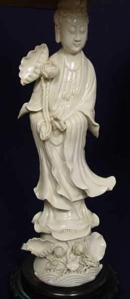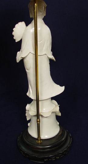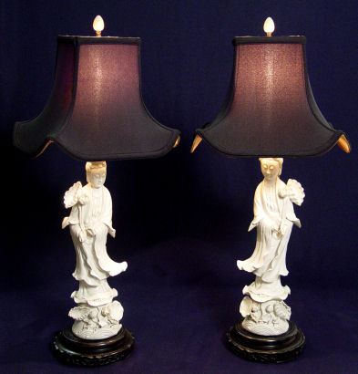 PAIR OF BLANC DE CHINE QUAN YEN FIGURES MOUNTED AS LAMPS: Black fabric shades lined in gold. Porcelain is 18''h, lamps are 31''h. overall.