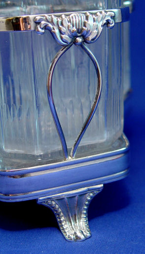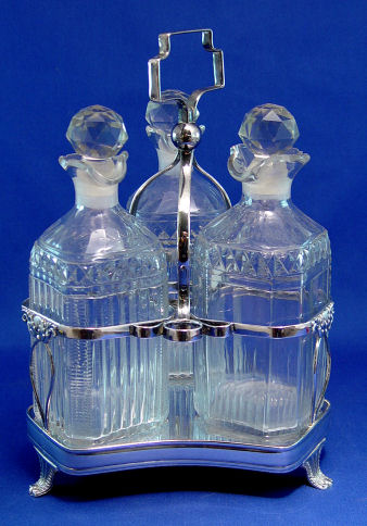 VICTORIAN SILVERPLATE DECANTER STAND BOTTLES: Matched set of square shaped bottles fit securely in stand. The silver is unmarked. 11''h. overall, bottle are 7 1/2''h.