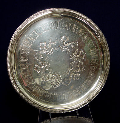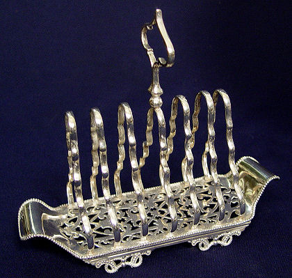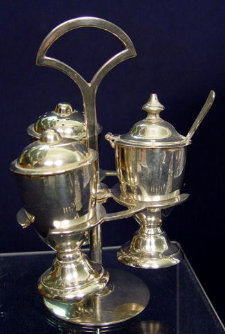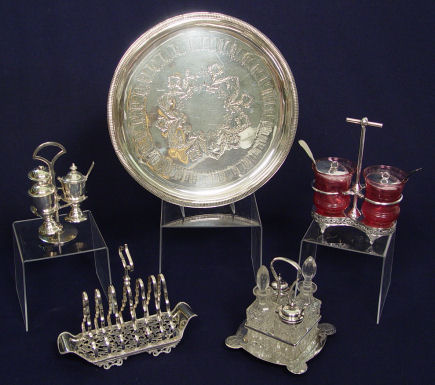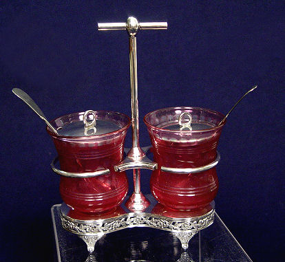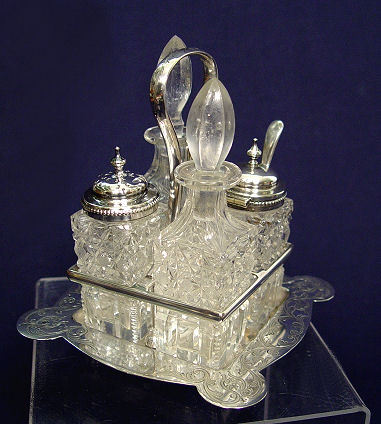ELEGANT SILVERPLATE TABLE WARE: Resting on a heavy 22 1/2'' 40'' tray engraved with butterflis and flowers is a toast rack, a three piece condiment stand, a four piece cruet stand with original bottles, and a 2 jar stand with crannberry glass covered jars and spoons.
