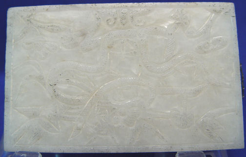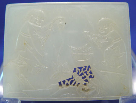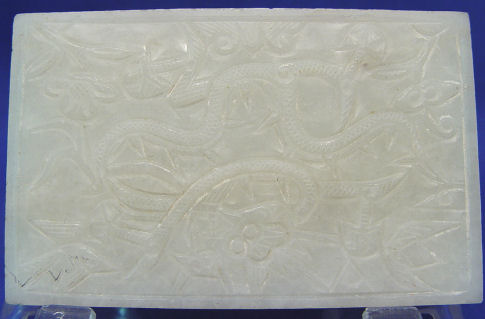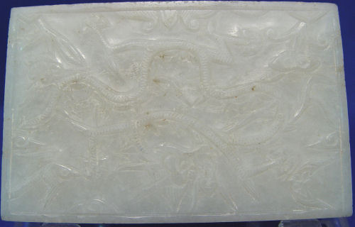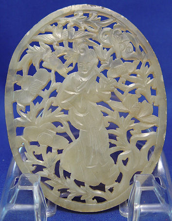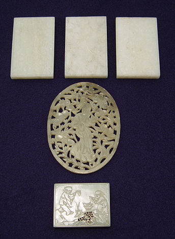 5 CARVED JADE PLAQUES: Large oval reticulated plaque, 4 1/4''l., 3 rectangular plaques, 3 1/4'' x 2'', and a smaller one at 2 6/8'' x 1 7/8''.