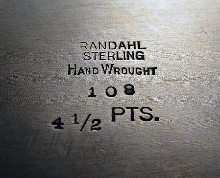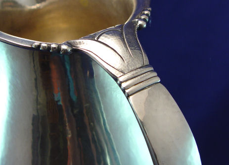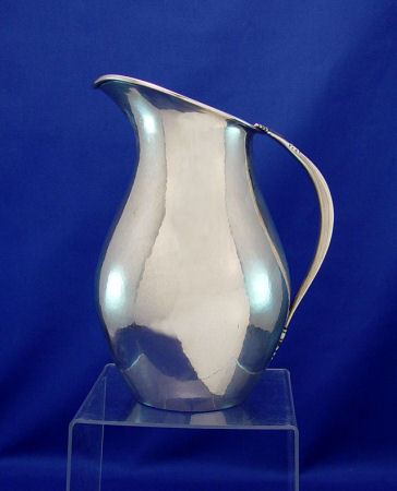 RANDAHL ARTS AND CRAFTS HAND WROUGHT STERLING PITCHER: Hammered finish, 9 1/2''h, #108, 4 1/2 pints. Approx. 30 0z. Please note small dent. Julius Randahl, founder of The Randahl Shop, worked with Tiffany, Gorham, and Kalo.