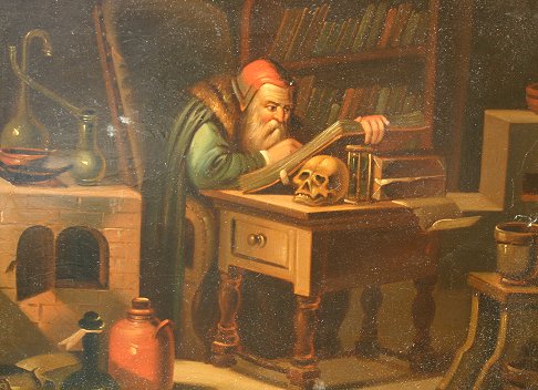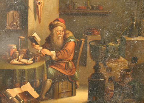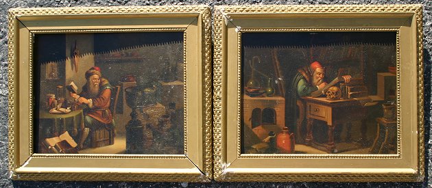 PAIR OF 19TH CENTURY OLD MASTER STYLE OILS/ON: Depicting interior scenes with scholar, no visible signatures, encased in overpainted and worn carved and gilded frames, 11 1/4'' x 13 1/4''.