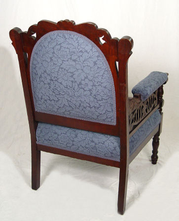AESTHETIC MOVEMENT ARMCHAIR, CA 1880: Carved wood arm chair, blue damask upholstery. 37 1/2''h., 24''w. at front.