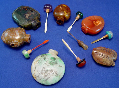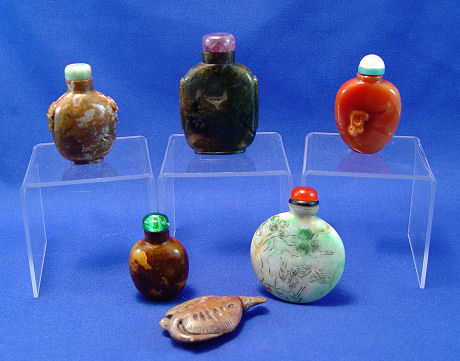 ESTATE COLLECTION OF 6 STONE SNUFF BOTTLES: Carved and smooth agate, carnelian, jade?, one in the form of a sting ray with fish stopper. Amethyst, quartz and other stone stoppers. 2 1/4-3 1/8''h. The fish bottle is signed.