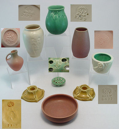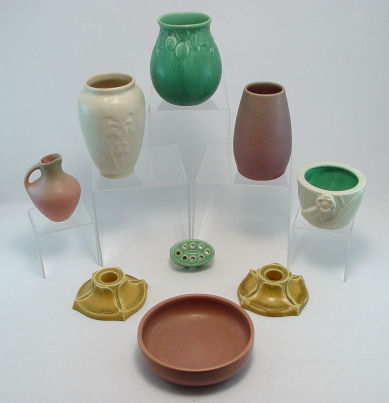 8 PIECE COLLECTION OF ROOKWOOD POTTERY: All matte glaze, chip and crack free, list as follows- 1) White #2123 vase, 1937, 5 1/2''h. 2) Green #2122 vase, 1929, 4 1/4''h. 3) Rose #2105, 1924, 4 3/4''. 4) Rose pitcher #6797, 1941, 3 3/4''. 5) Rose bowl #3610, 1917, 5 1/2'' dia. 6) White planter, #6433, 4 1/2'' dia, 1939. 7) Small green flower frog, 1915, 2 1/2''l. and 8) pair of yellow candle sticks, #2310, 1921.