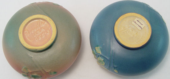 2 ROSEVILLE ''COLUMBINE'' VASES: One blue and yellow the other rose and green, 655-3''.