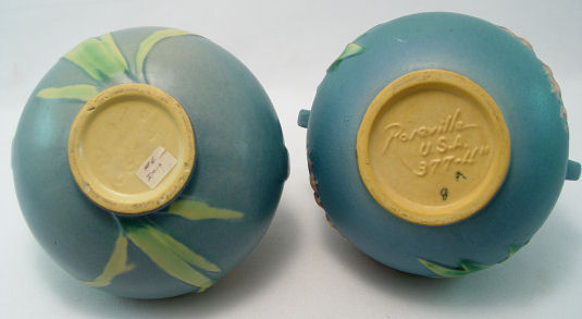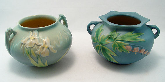 2 ROSEVILLE VASES: ''Bleeding Heart'' blue 377-4'' small glaze pop on edge of rim and ''Iris'' light green 357-4''. Sold as a lot.
