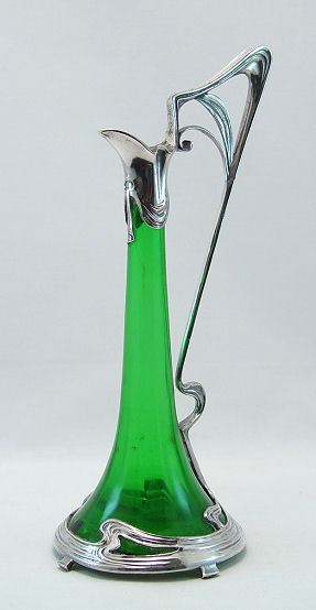 SILVER MOUNTED ART NOUVEAU EMERALD GREEN GLASS EWER: 11 1/2''h, no marking to the silverplate.