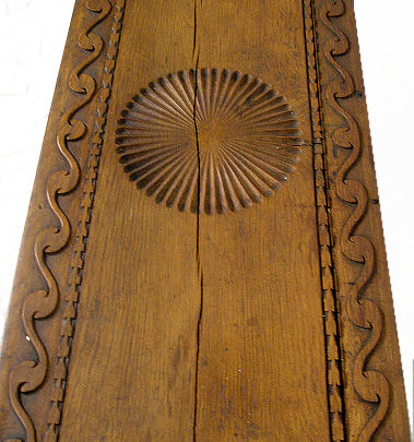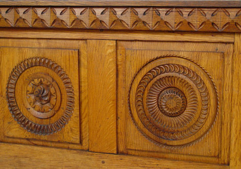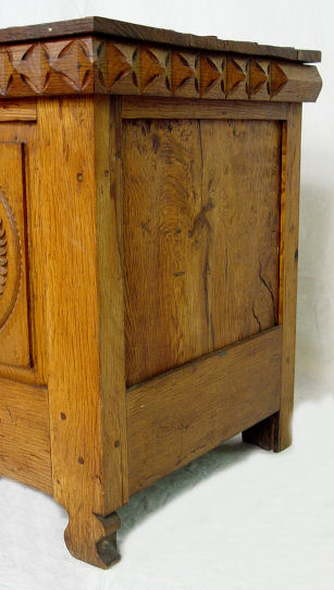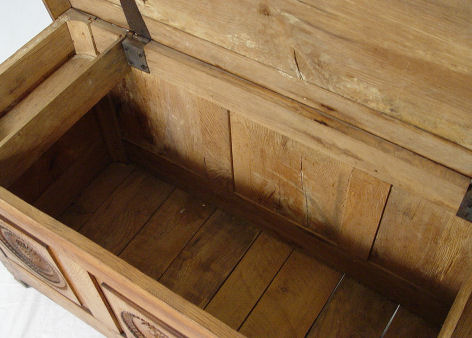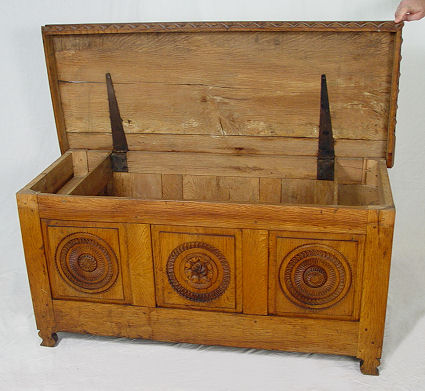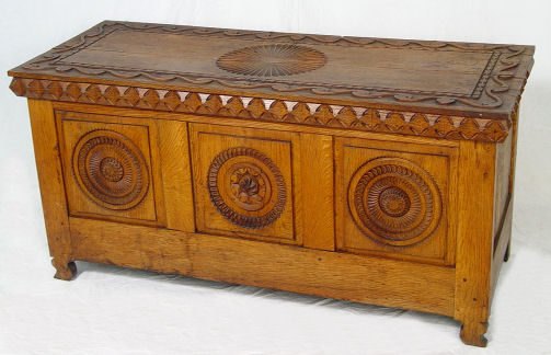 EXQUISITELY CARVED OAK TRUNK: Pegged construction, heavy hinged lid opens to reveal double ditty boxes, some age related wood separations, 50 1/8'' x 19 7/8'' X 28 1/2''.