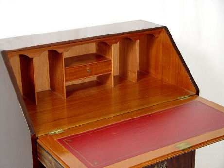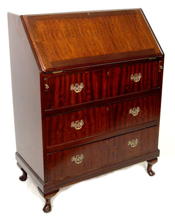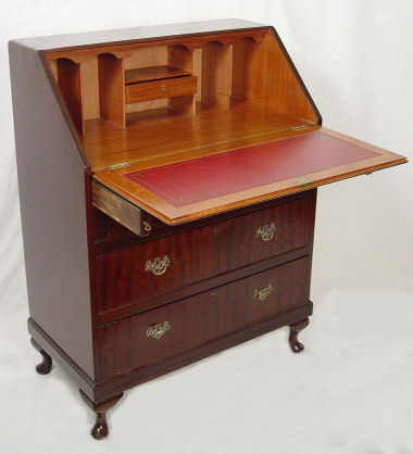 ENGLISH MAHOGANY SLANT FRONT DESK: Earlier 20th C., interior fitted with interior cubicles and drawers, red leather surface. Three exterior drawers. 30'' x 18'' x 43''.