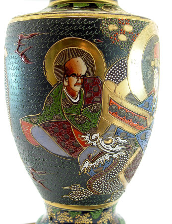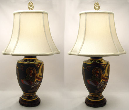 PAIR OF JAPANESE SATSUMA VASES MOUNTED AS LAMPS: Matched pair with cloth shades, brass finials. The earthenware itself is 12''h, the lamps are 26''h. overall.