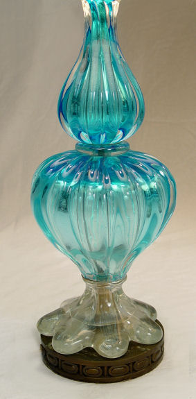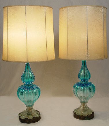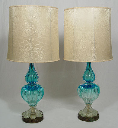 PAIR OF MURANO ART GLASS TABLE LAMPS: Constructed in three parts, mounted on metal bases. The glass portion is 19''h, lamps are 36''h. overall.