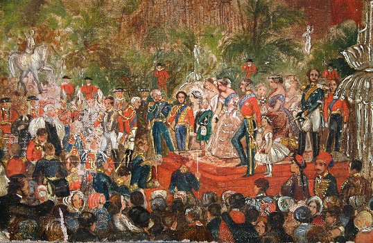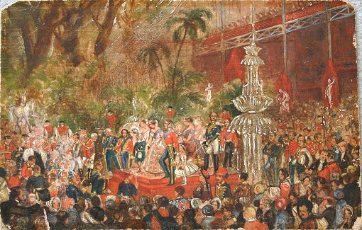 19TH CENTURY O/C OF THE CONVENING BY PRINCE ALBERT OF THE 1850 EXPOSITION AT THE CRYSTAL PALACE: This scene depicts the royal family with a large crowd and the interior of the grand structure, un-stretched and unframed, 6'' x 9 3/8''.