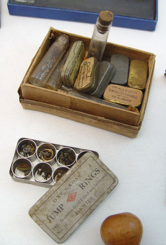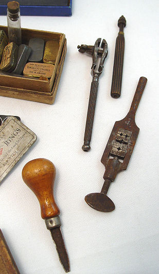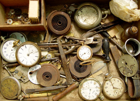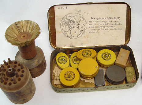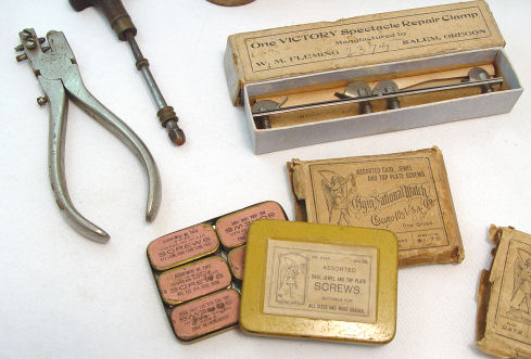COLLECTION OF ESTATE WATCH PARTS & TOOLS: To include, crystals, screws, springs, cases, files, pliers, blue hands, original tins, etc. Sold as a lot.