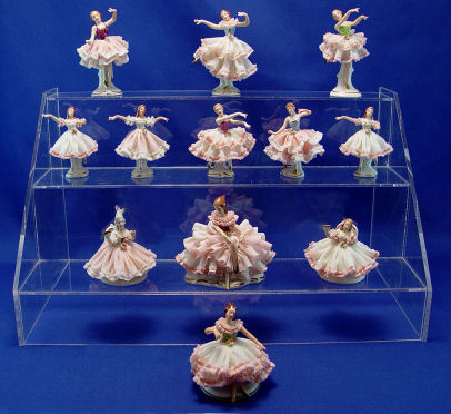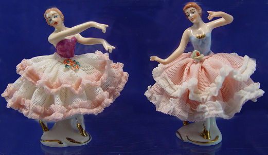 12 GERMAN DRESDEN ART MINIATURE LACY FIGURINES: Women in dancing and sitting positions. 2 1/4'' TO 4'' h. Remarkably good condition.