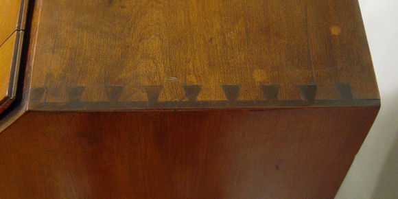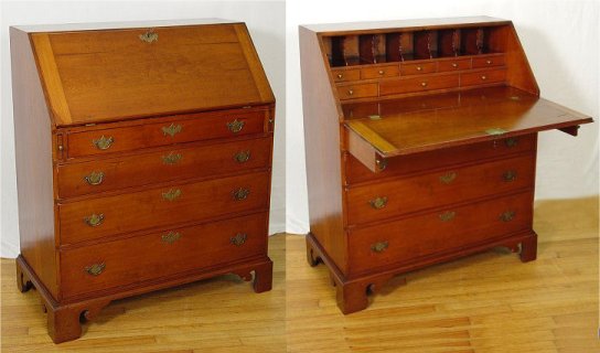 PERIOD PENNSYLVANIA CHIPPENDALE SLANT FRONT DESK: Ca. 18th C. Interior with pigeon holes and drawers, shaped bracket feet. Dovetail construction, paneled back. 44'' h. x 37'' w. x 18 3/4'' d. Est. $5000/7000**