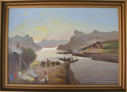 LANDSCAPE WITH INDIAN ENCAMPMENT ALONG THE RIVER: O/C, 26 1/2'' x 38'', signed lower right Villy? Engstrom, gilded frame with wear, 41'' x 43''.