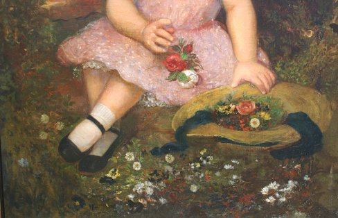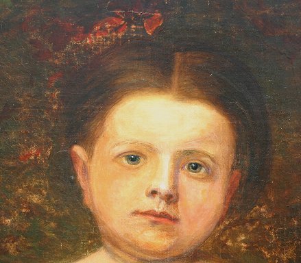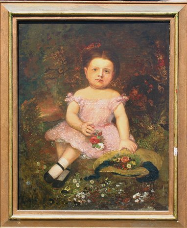 19TH/18TH? C. PORTRAIT OF A YOUNG FEMALE CHILD: O/C, 36'' x 19'', no visible signature, contained in a worn gold frame with missing gesso, 43'' x 35 1/2''.