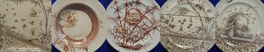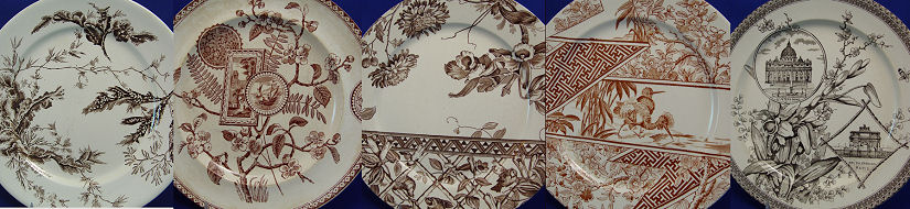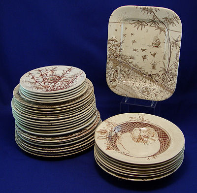 LARGE ESTATE COLLECTION OF 19th C STAFFORDSHIRE BROWN TRANSFERWARE: Approx. 33 pieces to include set of 6 Hill Pottery Rustic plates (9 7/8), 7 Brownsfield Neil soup bowls, 5 Chatsworth plates (7'') and a few extra mixed patterns. The group of Melbourne includes an 11'' platter, 5 plates (9 1/4''), and 4 plates (10 1/2''). Please note some chipping.